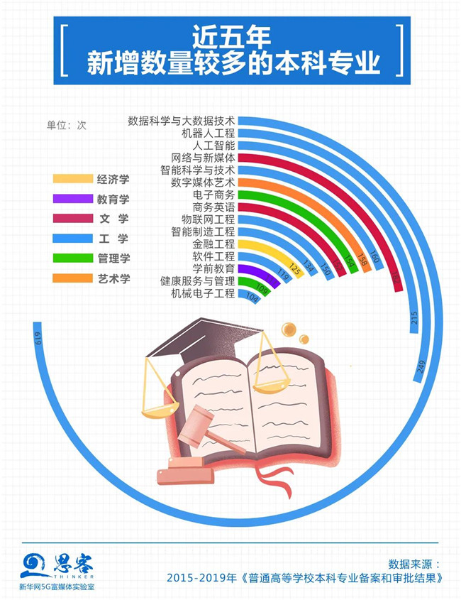 工學新增專業(yè)數(shù)量遙遙領先。數(shù)據(jù)顯示,近五年新增數(shù)量較多的數(shù)據(jù)科學與大數(shù)據(jù)技術、機器人工程和人工智能等專業(yè)都屬于工學。這些專業(yè)也是特設專業(yè)(專業(yè)代碼后加T表示),根據(jù)高校的辦學特色或者是近幾年來人才的培養(yǎng)特殊需求設置。與每五年調整一次的基本專業(yè)不同,特設專業(yè)可以每年調整一次,兩種特性的專業(yè)可以分別管理。
