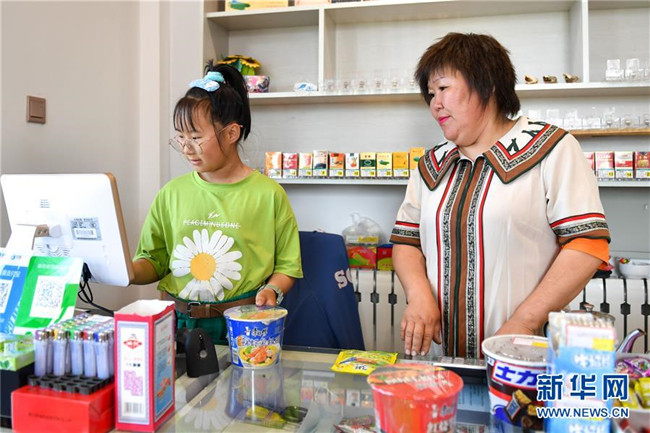 索云(右)在位于敖魯古雅鄂溫克族鄉(xiāng)的自家超市內(nèi),指導女兒為顧客結賬(7月14日攝)。 新華社記者 貝赫 攝