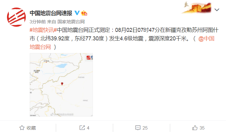 中國(guó)地震臺(tái)網(wǎng)正式測(cè)定:08月02日07時(shí)47分在新疆克孜勒蘇州阿圖什市(北緯39.92度,東經(jīng)77.30度)發(fā)生4.6級(jí)地震,震源深度20千米。