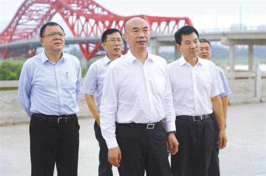 八月十一日,省委書記劉國中到寶雞市調(diào)研檢查防汛工作。圖為他在渭河寶雞城區(qū)抗洪紀(jì)念碑段,察看渭河水位水勢(shì),了解防汛備汛措施落實(shí)情況。 本報(bào)記者 張辰攝