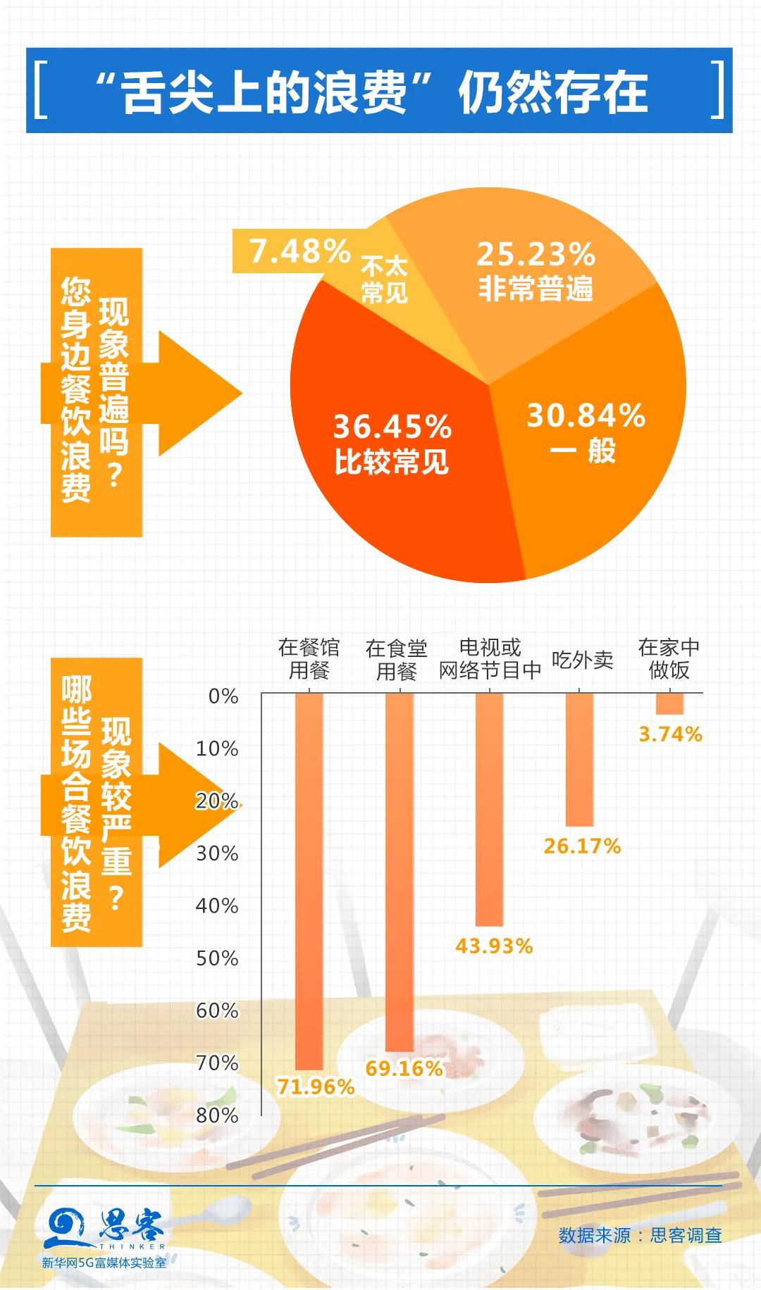 餐飲浪費(fèi)現(xiàn)象觸目驚心,令人痛心!超過九成受訪者表示身邊存在不同程度的餐飲浪費(fèi)現(xiàn)象。約七成受訪者認(rèn)為在外用餐、在食堂就餐時(shí)浪費(fèi)現(xiàn)象較嚴(yán)重。