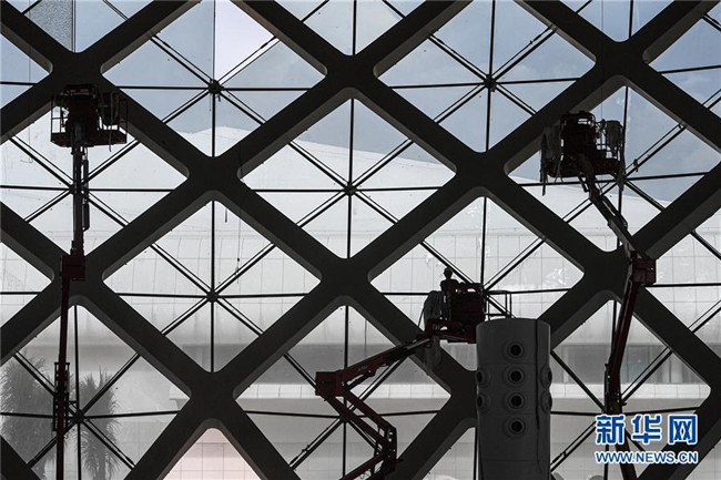 8月25日,工人在位于海口的海南國(guó)際會(huì)展中心二期項(xiàng)目施工。新華社記者 蒲曉旭 攝