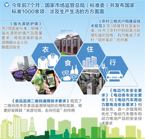 今年前7個月,國家市場監(jiān)管總局(標準委)共發(fā)布國家標準十余批,數(shù)量達到1000余項,涉及衛(wèi)生防護、健康安全、食品、消費品、信息技術(shù)、交通運輸、工業(yè)制造、農(nóng)業(yè)農(nóng)村等多個領域,幾乎涵蓋了社會經(jīng)濟中的方方面面。從消毒劑安全性評價,到家用電器噪聲界定,再到超高清電視能效指標……小到吃穿住行,大到經(jīng)濟發(fā)展,一批批國家標準正在改變我們的生活。