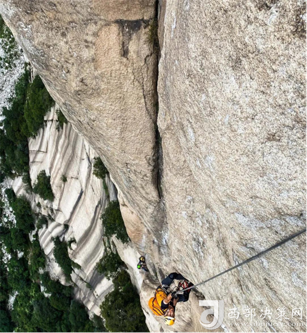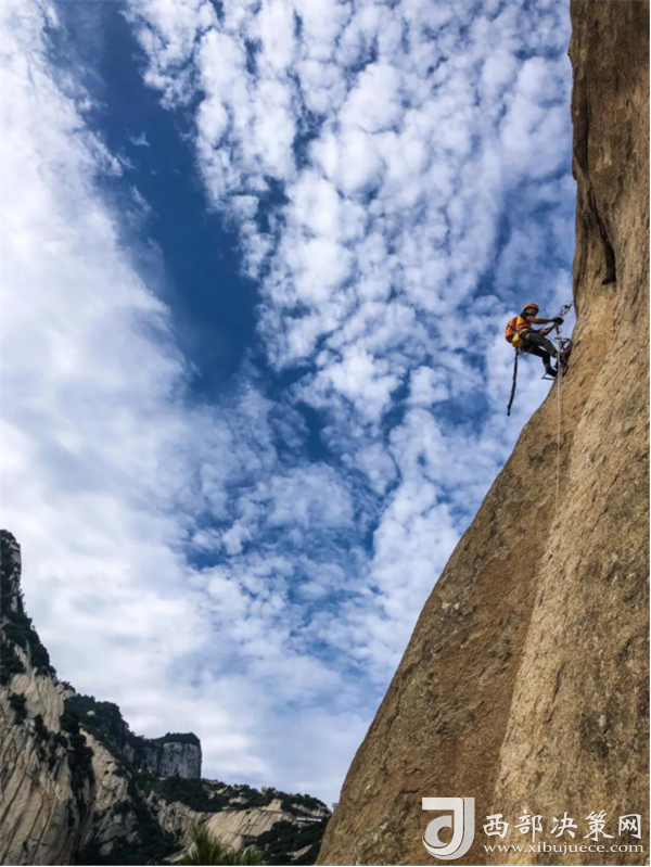 自然巖壁結(jié)組攀登源自軍事特戰(zhàn)項目,它就像是巖壁上的“馬拉松”,攀登大巖壁路線,攀巖隊伍需要使用吊帳和拖包等更多安全裝備完成多日攀登。從最基礎(chǔ)的攀登動作練習(xí),到完成近千米的大巖壁攀登,這不僅將考驗運動員們的攀巖技術(shù),還要挑戰(zhàn)他們在巖壁上的生存能力。此次自然巖壁結(jié)組攀登的巖壁甄選白云峰,其位于華山北峰云臺峰之北,石白如雪,一年四季白云繚繞,隨云飄浮而升降起伏,如海中的大魚隨浪翻滾,極其壯觀,而攀巖隊員們此次就需要在這600多米高的巖壁線路上生活至少2天。
