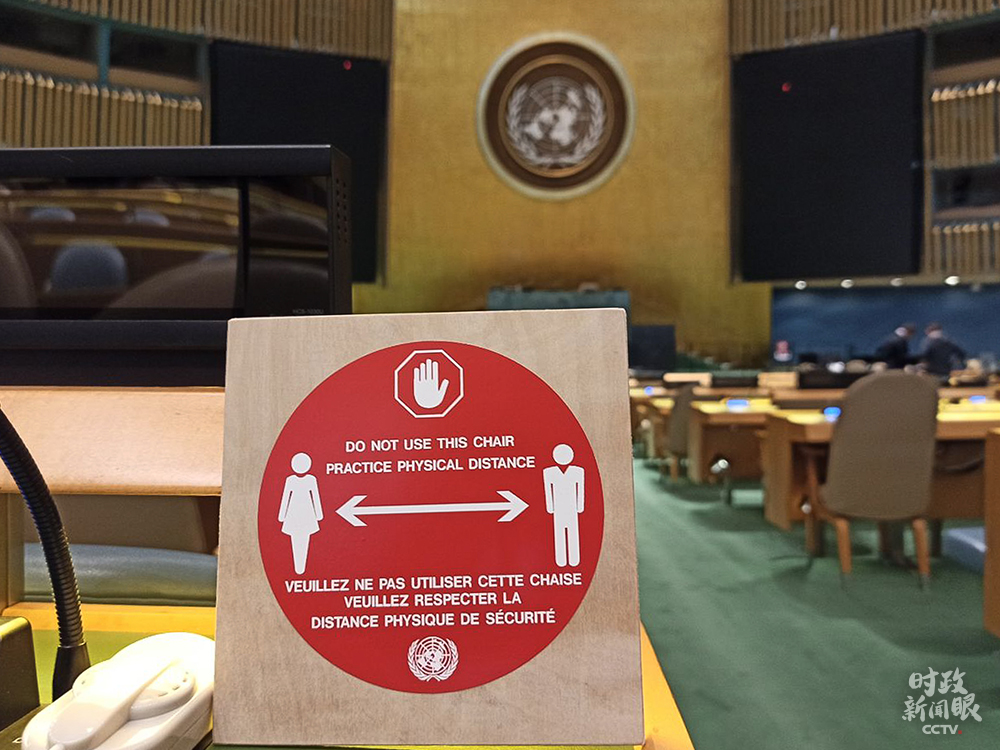 △視頻會見現(xiàn)場擺放的中國國旗和聯(lián)合國旗(總臺央視記者范一鳴拍攝)