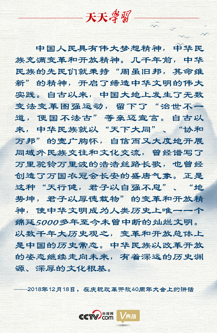 改革創(chuàng)新是時(shí)代精神,是民族進(jìn)步之魂。2018年12月18日,在慶祝改革開(kāi)放40周年上大會(huì)的講話中,習(xí)近平總書(shū)記回顧了5000多年中華文明史,他引用“治世不一道,便國(guó)不必法古”這句閃耀著歷史進(jìn)化論思想光芒的古語(yǔ),說(shuō)明在新時(shí)代,中國(guó)人民將繼續(xù)自強(qiáng)不息、自我革新,中國(guó)變革創(chuàng)新的腳步永不停歇。