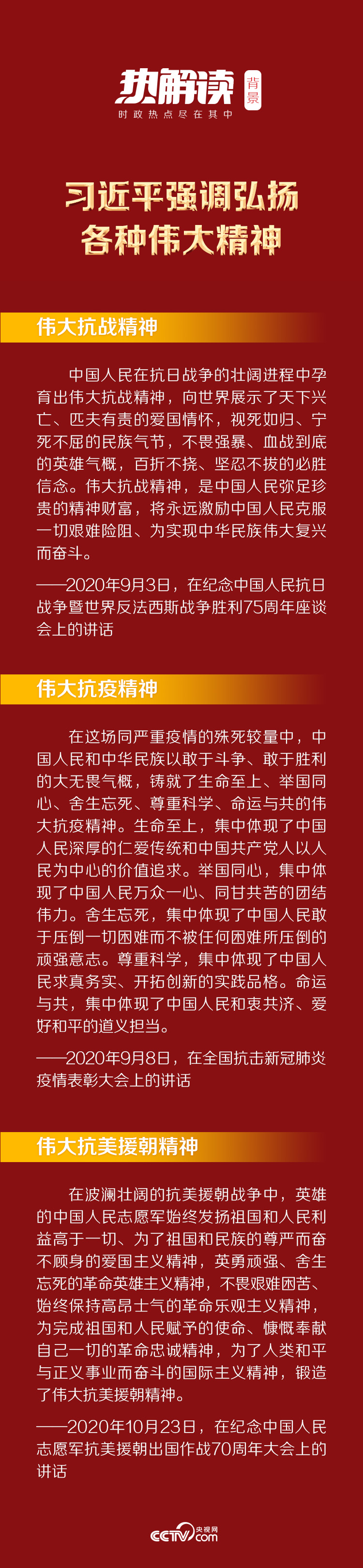 今年以來,總書記多次詮釋各種精神:偉大抗戰(zhàn)精神、偉大抗疫精神、偉大抗美援朝精神……在歷史回響中,帶我們接受思想洗禮,汲取奮勇前行的精神力量。