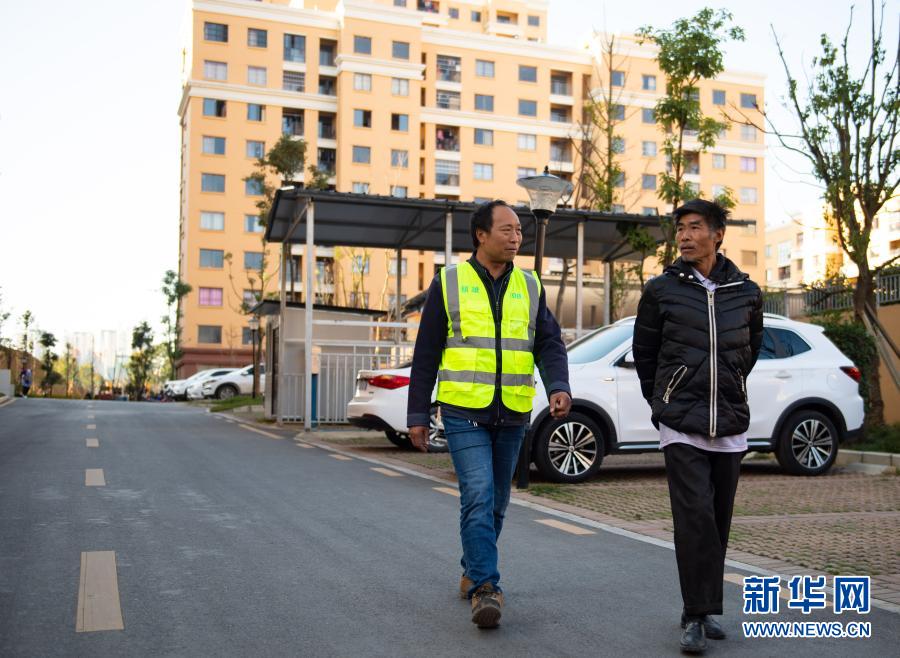 馮登友(左)在云南省鎮(zhèn)雄縣魯家院子易地扶貧搬遷安置點巡邏時與搬遷群眾聊天(11月10日攝)。新華社記者 王冠森 攝