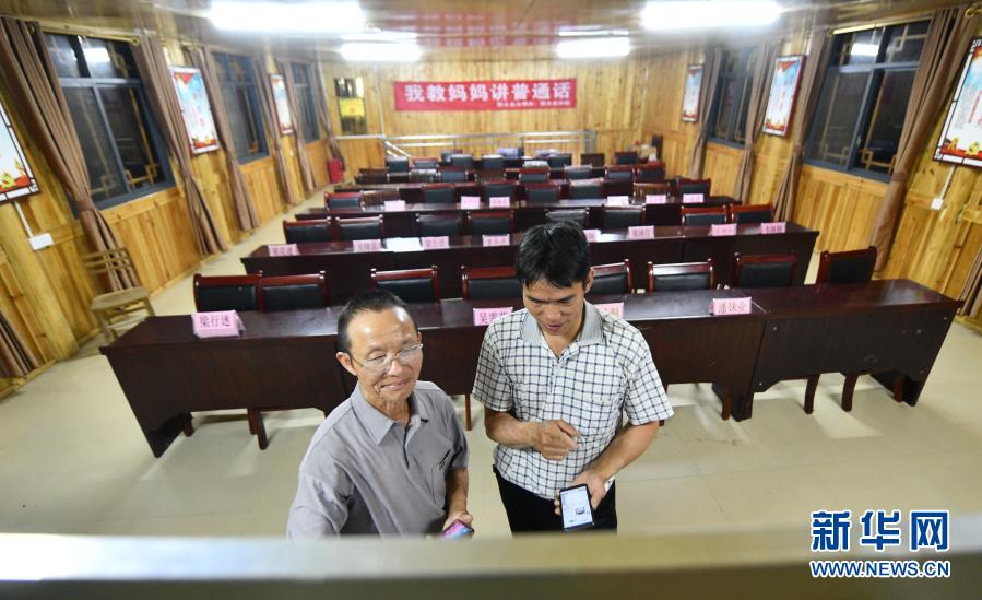 在烏英苗寨,黨鳩村村委會副主任梁秀平(右)在研究“雙語雙向”培訓班的課堂內(nèi)容(6月18日攝)。新華社記者 黃孝邦 攝