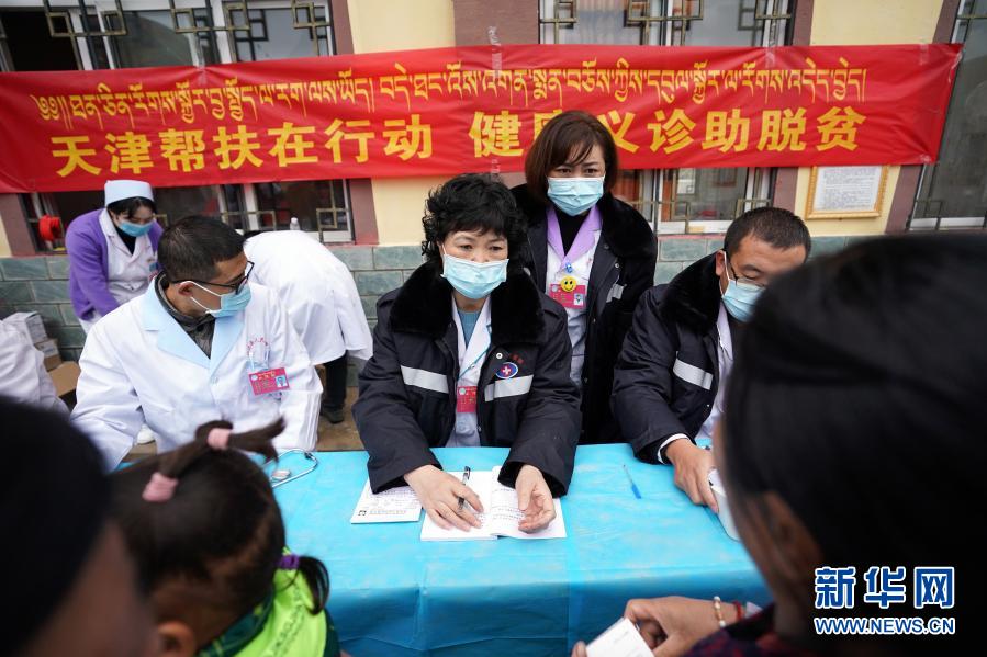 在西藏昌都市江達縣卡貢村,天津援藏醫(yī)生王佩華(中)為村民義診(9月26日攝)。新華社記者 詹彥 攝