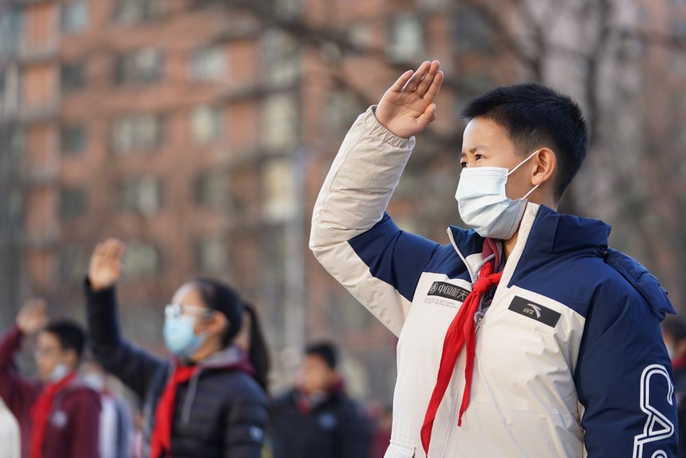 12月21日,在北京四中廣外校區(qū),蔡昊霖(前)和同學一起參加升旗儀式。