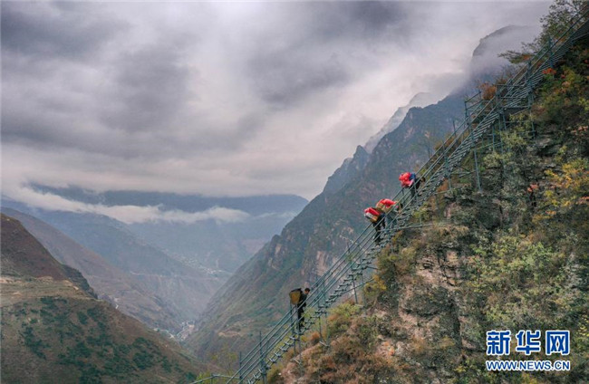 12月23日,某色蘇不惹(中)和同伴在鋼梯上休息,他們正通過鋼梯把修民宿的建材往村里背。新華社記者 江宏景 攝