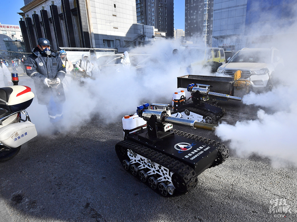 △1月9日,北京岳各莊市場(chǎng),2臺(tái)“坦克”防疫消殺機(jī)器人對(duì)市場(chǎng)進(jìn)行消殺。這種消殺“新裝備”裝有大容量藥壺,每小時(shí)消殺約10000平方米。