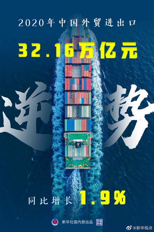 新華社北京1月14日電(記者劉紅霞)海關(guān)總署14日發(fā)布數(shù)據(jù),2020年我國(guó)貨物貿(mào)易進(jìn)出口總值32.16萬(wàn)億元,同比增長(zhǎng)1.9%,在新冠肺炎疫情和單邊主義保護(hù)主義等多重壓力之下創(chuàng)歷史新高,成為全球唯一實(shí)現(xiàn)貨物貿(mào)易正增長(zhǎng)的主要經(jīng)濟(jì)體。