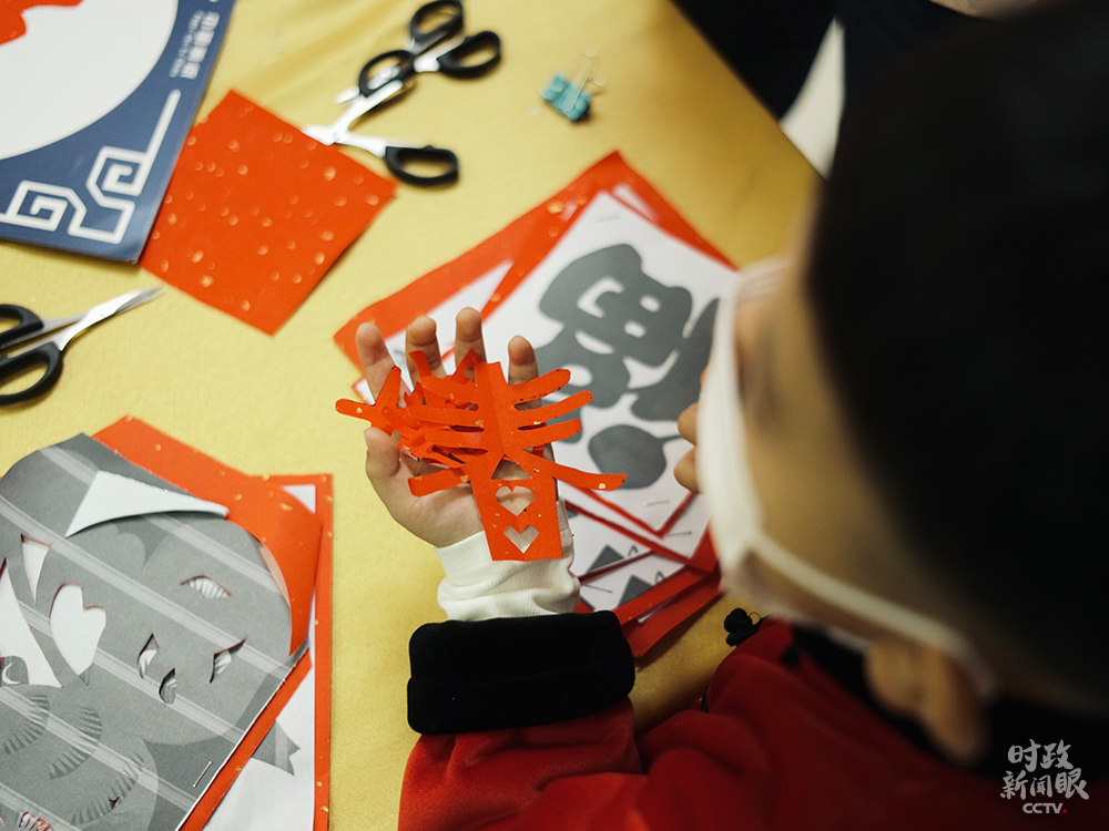 △孩子們在社區(qū)活動(dòng)室練習(xí)剪紙。(總臺(tái)央視記者王哈男拍攝)