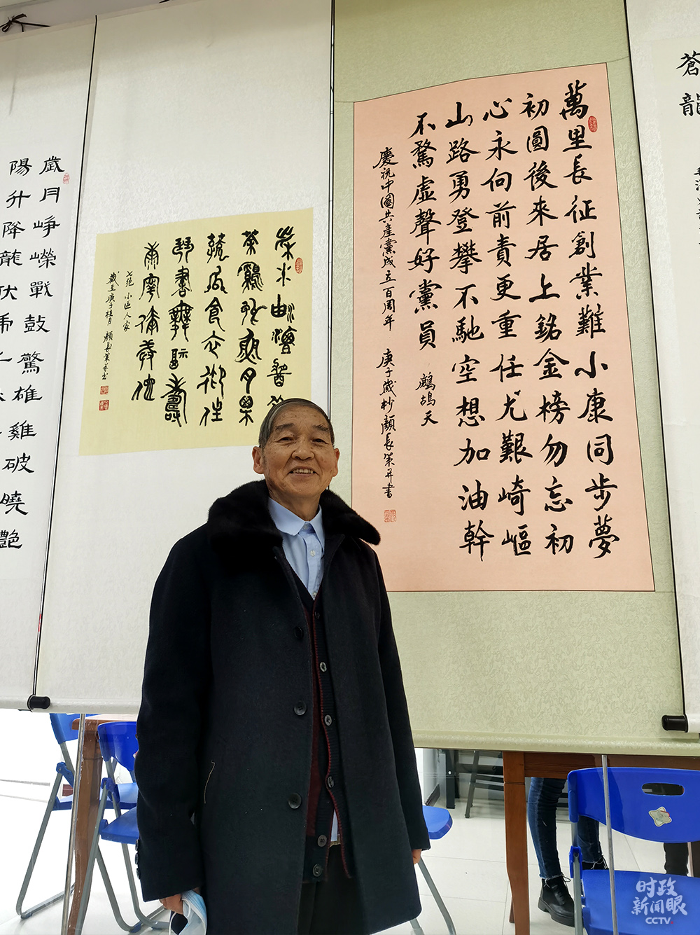 △這是87歲的社區(qū)居民顏長策老先生為慶祝中國共產(chǎn)黨成立100周年創(chuàng)作并書寫的詩作。(總臺(tái)央視記者姚瑤拍攝)