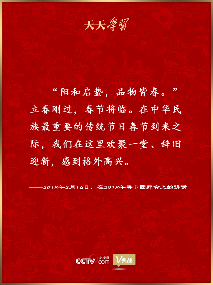 黨的十八大以來(lái),習(xí)近平總書(shū)記多次在臘月二十九舉行的春節(jié)團(tuán)拜會(huì)上發(fā)表重要講話,盤(pán)點(diǎn)舊歲、謀劃新年,向全國(guó)各族人民、港澳臺(tái)同胞和海外僑胞拜年,并致以美好的新春祝福。在講話中,習(xí)近平總書(shū)記頻頻引用具有新春節(jié)令特點(diǎn)的古代經(jīng)典詩(shī)文名句抒發(fā)情懷、暢想未來(lái)。這些詩(shī)文名句如春風(fēng)化雨潤(rùn)人心田、暖人心扉,激勵(lì)著億萬(wàn)人民在新的一年里追夢(mèng)前行。