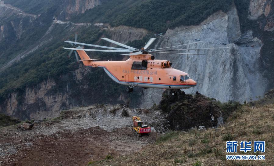 米-26重型直升機(jī)吊運(yùn)一臺(tái)挖掘機(jī)抵達(dá)四川省布拖縣阿布洛哈村上空準(zhǔn)備降落(2019年12月5日攝)。為了打通四川省布拖縣阿布洛哈通村公路,施工單位租用的一架米-26重型直升機(jī)克服高山峽谷、天氣多變等不利因素,從布拖縣城吊運(yùn)大型施工設(shè)備到阿布洛哈村,為兩邊分頭掘進(jìn)施工提供大型機(jī)械保障。新華社記者 江宏景 攝