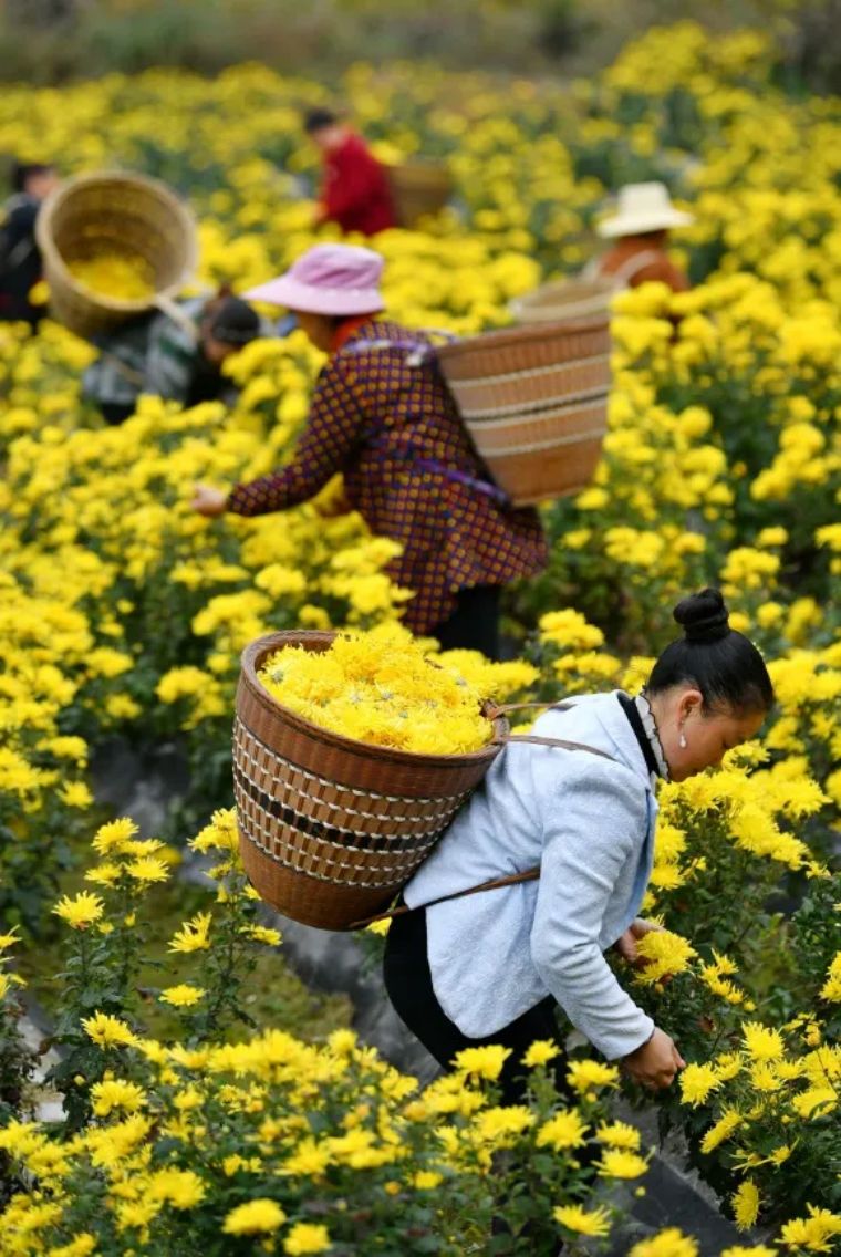 ↑2020年10月29日,湖北省恩施土家族苗族自治州宣恩縣曉關(guān)侗族鄉(xiāng)黃草壩村農(nóng)民在采摘金絲皇菊。在當(dāng)?shù)囟弊迦罕娋劬訁^(qū),農(nóng)民們?cè)隈v村扶貧工作隊(duì)的引導(dǎo)下積極種植金絲皇菊。“合作社+基地+農(nóng)戶”的種植模式提高了農(nóng)民抵御市場風(fēng)險(xiǎn)的能力,激發(fā)了農(nóng)民耕作土地的積極性,促進(jìn)深山侗族群眾脫貧增收。