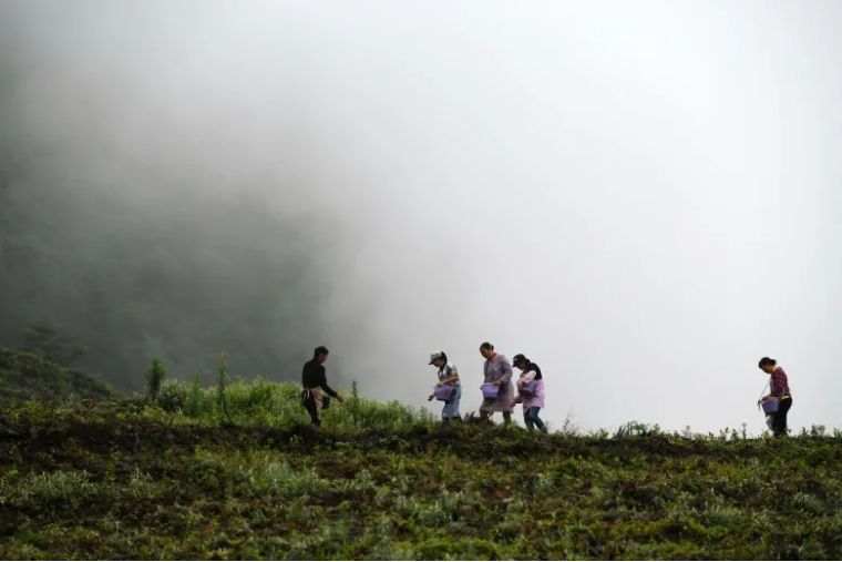 ↑2019年7月7日,農(nóng)民在貴州省普安縣地瓜鎮(zhèn)屯上村的“扶貧茶園”里給茶苗施肥。為幫助貧困地區(qū)群眾脫貧,2018年浙江安吉黃杜村將“白葉一號(hào)”白茶苗捐贈(zèng)給貴州省普安縣、沿河土家族自治縣,湖南省古丈縣,四川省青川縣等3省4縣,覆蓋貧困戶1862戶。