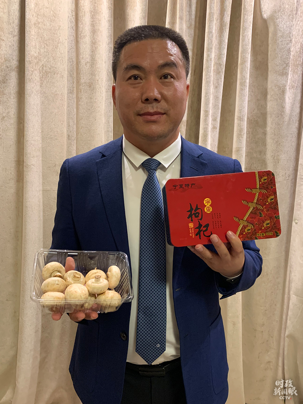 △閩寧鎮(zhèn)黨委書記張文帶來(lái)家鄉(xiāng)特產(chǎn)蘑菇、枸杞。(總臺(tái)央視記者范一鳴拍攝)