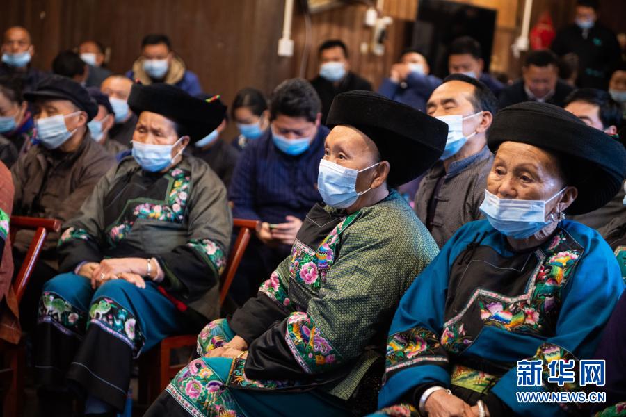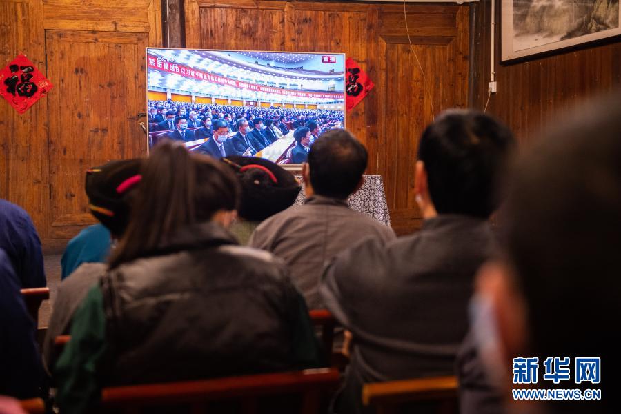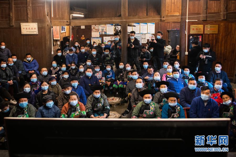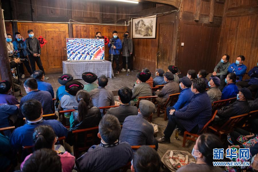 2月25日上午,在湖南省湘西土家族苗族自治州花垣縣十八洞村,當?shù)馗刹俊⑷罕娫谝粦舸迕窦沂湛慈珖撠毠钥偨Y表彰大會直播。新華社記者 陳思汗 攝