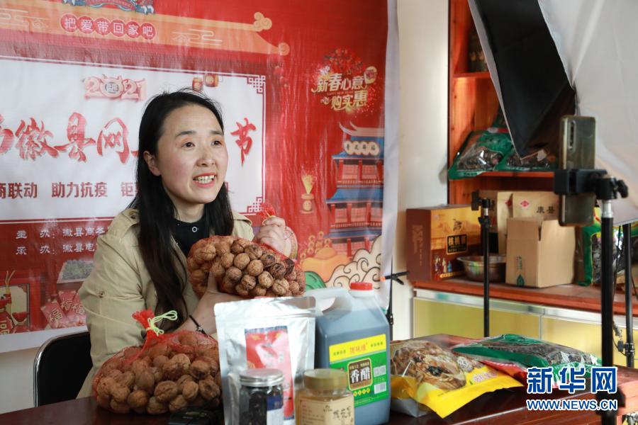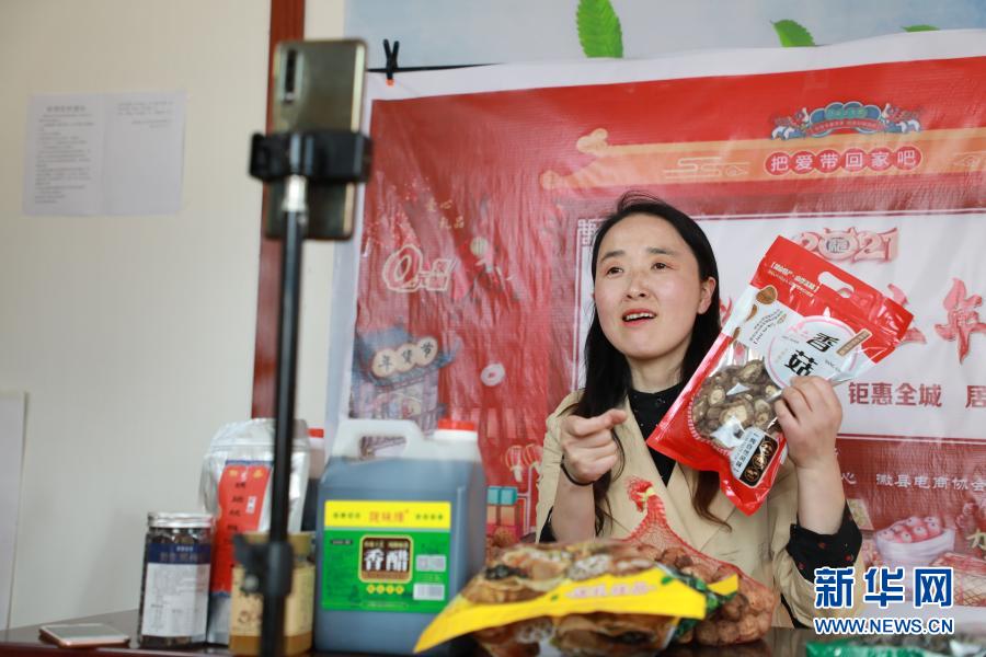 2月23日,在位于甘肅隴南市徽縣的店鋪中,全國(guó)人大代表梁倩娟在網(wǎng)上直播銷(xiāo)售當(dāng)?shù)剞r(nóng)特產(chǎn)品。 新華社記者 張智敏 攝