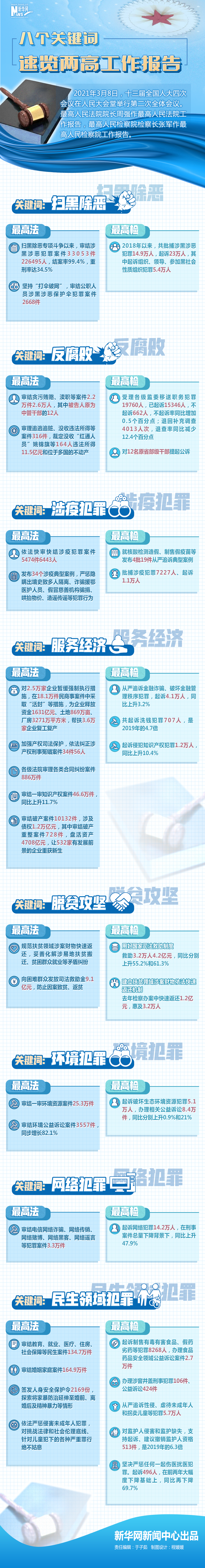 8日提請十三屆全國人大四次會議審議的兩高報告,交出一份滿滿的成績單。掃黑除惡“打傘破網(wǎng)”、嚴(yán)懲腐敗守護平安、加強民生司法保障……一串串?dāng)?shù)字勾勒出法治中國建設(shè)的亮點。