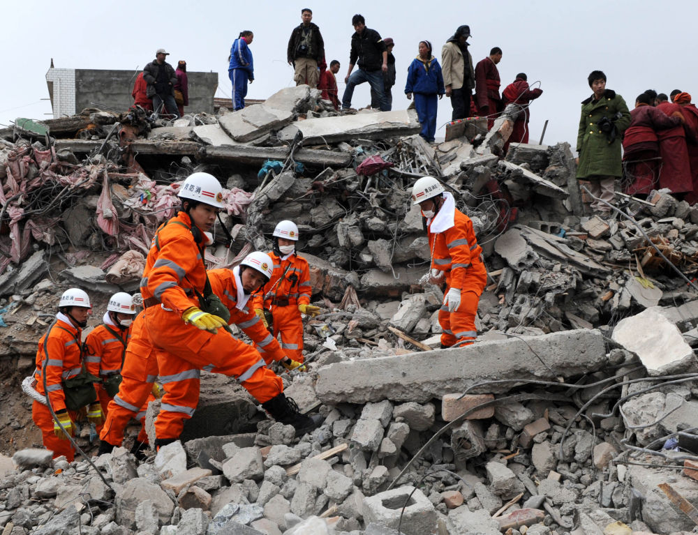 ↓ 圖為2010年4月16日,救援隊(duì)員在結(jié)古鎮(zhèn)民族賓館廢墟上進(jìn)行搜救。