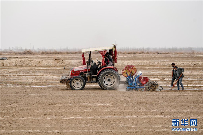 在位于新疆喀什地區(qū)莎車縣的棉田里,農(nóng)民在播種棉籽(3月26日攝)。新華社記者 馬鍇 攝