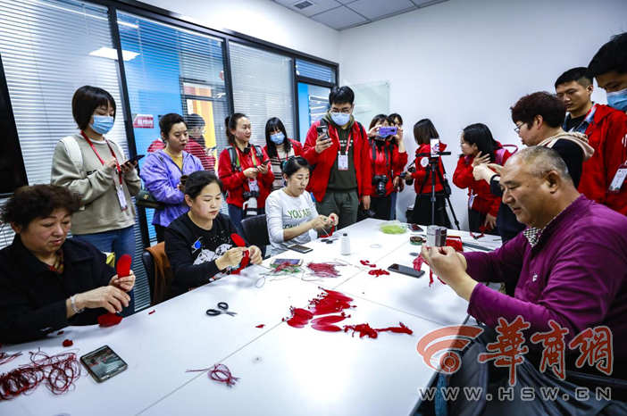 一折、一卷、六朵花瓣整齊羅列,細(xì)鐵絲緊緊繞圈固定,一朵火紅的手工花便成型了。“這個(gè)是我們的一些手工藝品,都是有延安特色的,如果你們想學(xué)的話,隨時(shí)來(lái),我們這里免費(fèi)培訓(xùn)。”3月30日,在延安市寶塔區(qū)電商直播融合孵化服務(wù)中心的直播間里,60歲的退休工人董智玲正在直播間里給網(wǎng)友直播手工藝品制作,引來(lái)了眾多記者的圍觀。
