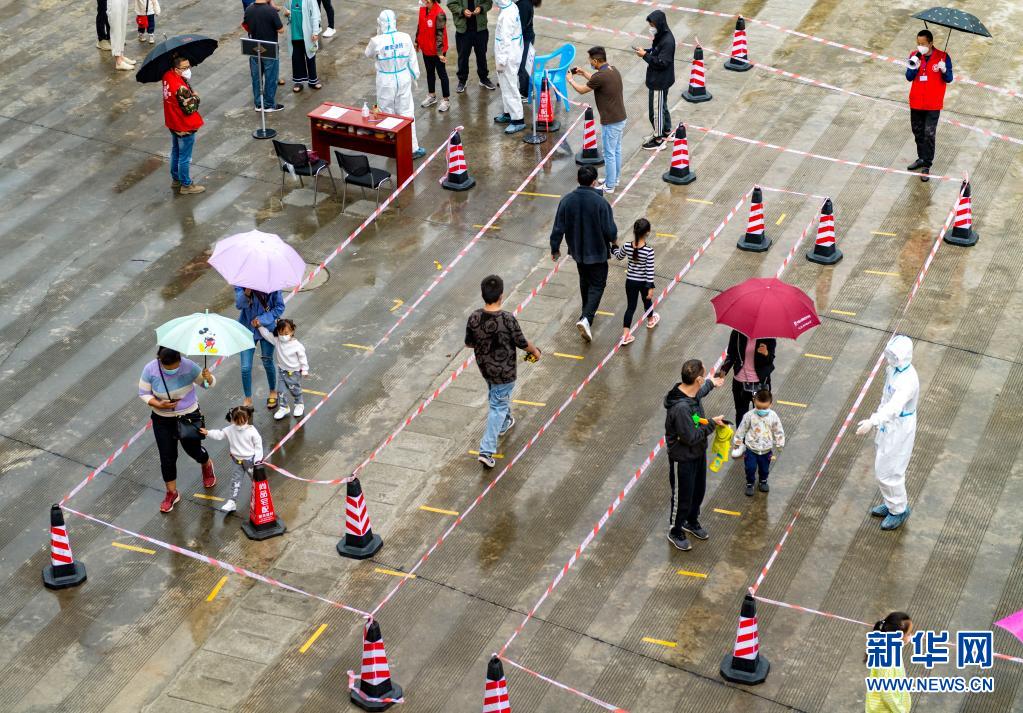 4月6日,在瑞麗市目瑙社區(qū)一核酸檢測(cè)點(diǎn),當(dāng)?shù)鼐用裢ㄟ^設(shè)置的通道排隊(duì)采樣。新華社記者 陳欣波 攝