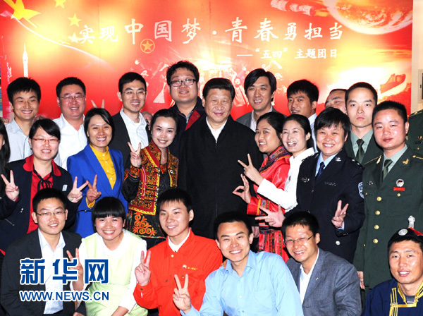 2013年5月4日,中共中央總書記、國家主席、中央軍委主席習(xí)近平來到中國航天科技集團(tuán)公司中國空間技術(shù)研究院,同各界優(yōu)秀青年代表座談并發(fā)表重要講話。這是座談會前,習(xí)近平和在展廳參觀的優(yōu)秀青年代表合影。新華社記者 饒愛民 攝