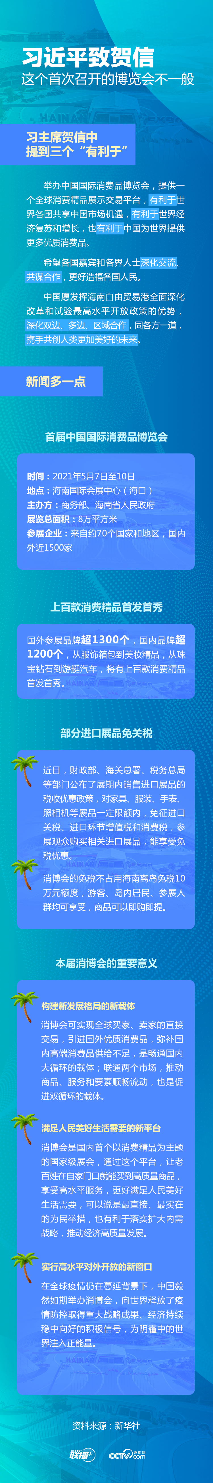聯(lián)播+“中國愿發(fā)揮海南自由貿(mào)易港全面深化改革和試驗(yàn)最高水平開放政策的優(yōu)勢(shì),深化雙邊、多邊、區(qū)域合作,同各方一道,攜手共創(chuàng)人類更加美好的未來。”5月6日,習(xí)近平主席向首屆中國國際消費(fèi)品博覽會(huì)致賀信。
