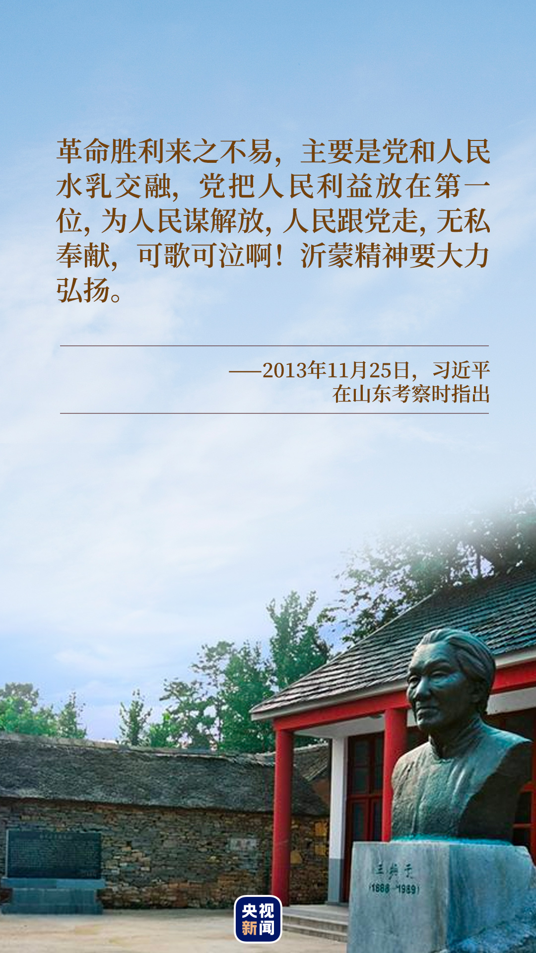 “在沂蒙這片紅色土地上,誕生了無數可歌可泣的英雄兒女,沂蒙六姐妹、沂蒙母親、沂蒙紅嫂的事跡十分感人。”習近平總書記深情地說。2013年11月25日,習近平在視察山東沂蒙革命老區(qū)臨沂期間,專程前往華東革命烈士陵園,向革命烈士紀念塔敬獻花籃并參觀沂蒙精神展。