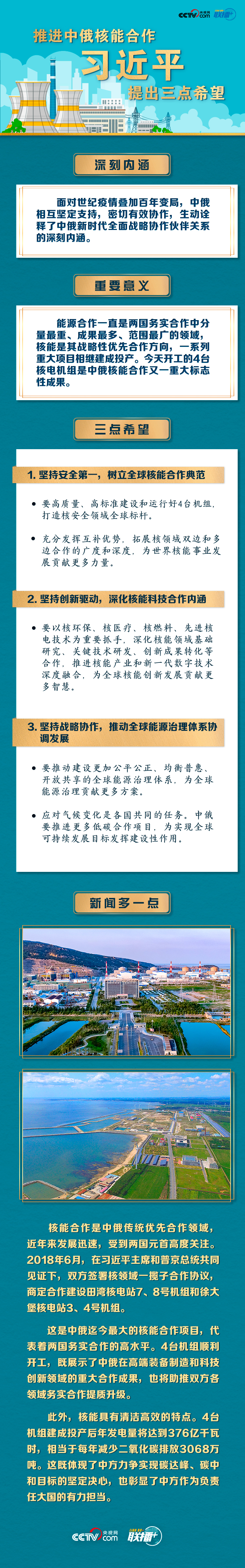 聯(lián)播+“今年是《中俄睦鄰友好合作條約》簽署20周年。我同普京總統(tǒng)商定,將在更高水平、更廣領(lǐng)域、更深層次推進(jìn)雙邊關(guān)系向前發(fā)展。”5月19日,習(xí)近平主席在北京通過視頻連線,同俄羅斯總統(tǒng)普京共同見證兩國核能合作項目——田灣核電站和徐大堡核電站開工儀式。