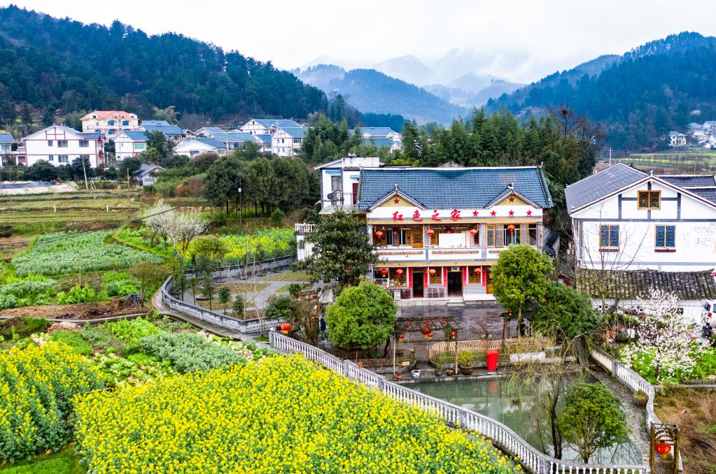 遵義市楓香鎮(zhèn)花茂村村民王治強(qiáng)經(jīng)營的“紅色之家”農(nóng)家樂(2020年2月28日攝,無人機(jī)照片)。新華社記者陶亮攝