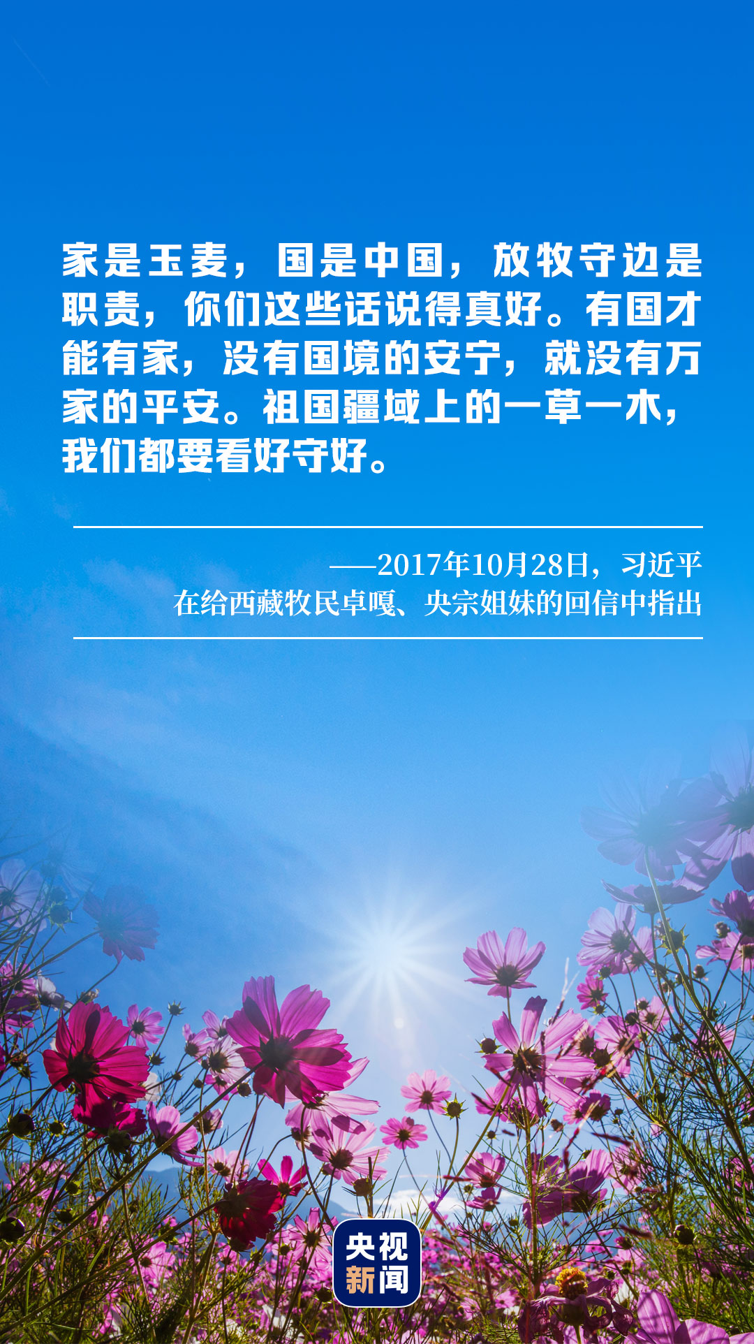 2017年10月,習(xí)近平給卓嘎、央宗姐妹回信,稱贊兩姐妹“家是玉麥,國是中國”的境界,強(qiáng)調(diào)“有國才能有家,沒有國境的安寧,就沒有萬家的平安”。