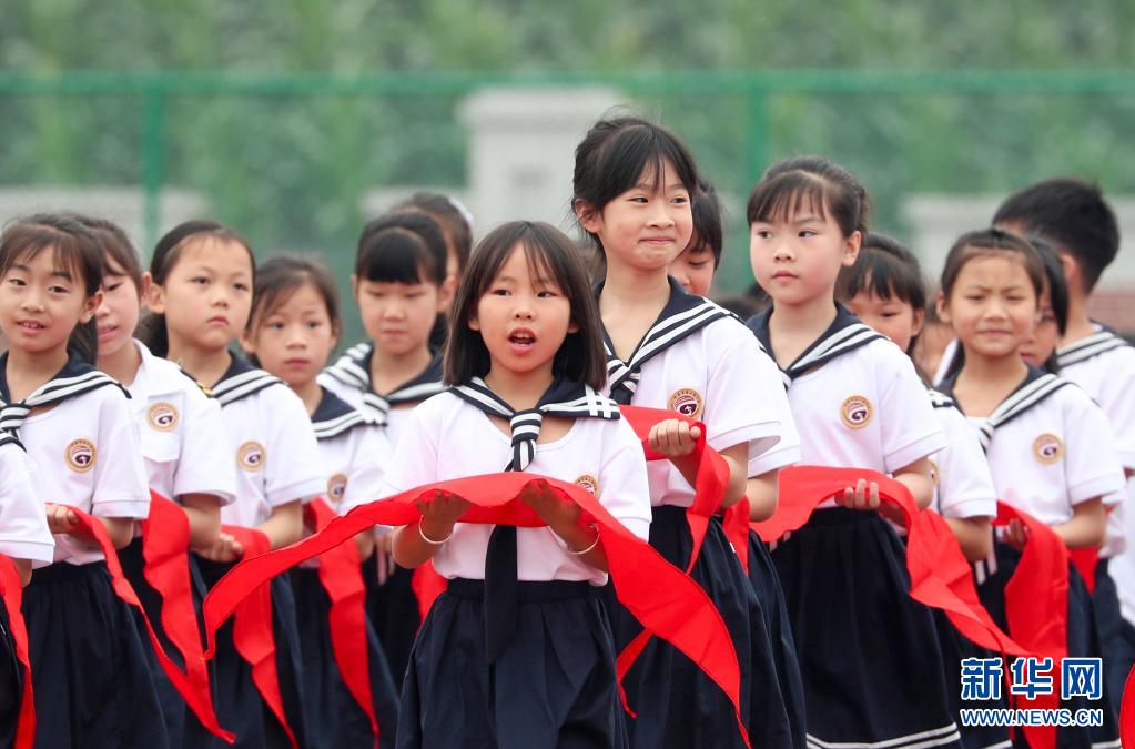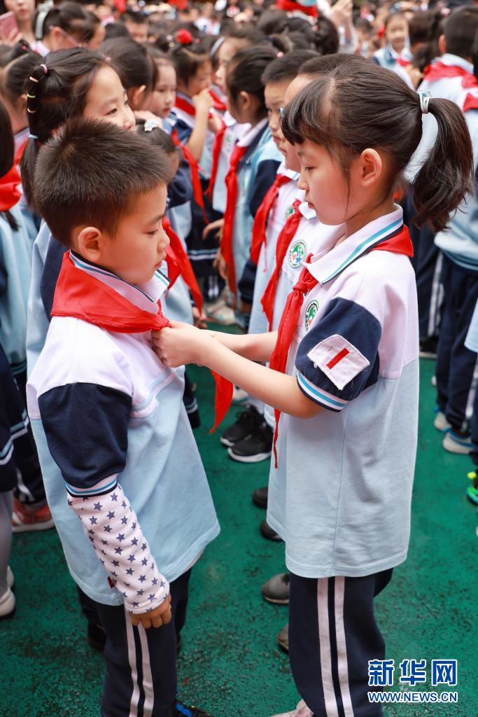 當(dāng)日,廣西南寧市濱湖路小學(xué)舉行“紅領(lǐng)巾心向黨 爭(zhēng)做新時(shí)代好隊(duì)員”為主題的少先隊(duì)員入隊(duì)儀式,一年級(jí)學(xué)生在“六一”前戴上紅領(lǐng)巾,光榮加入中國(guó)少年先鋒隊(duì)?!?/p>