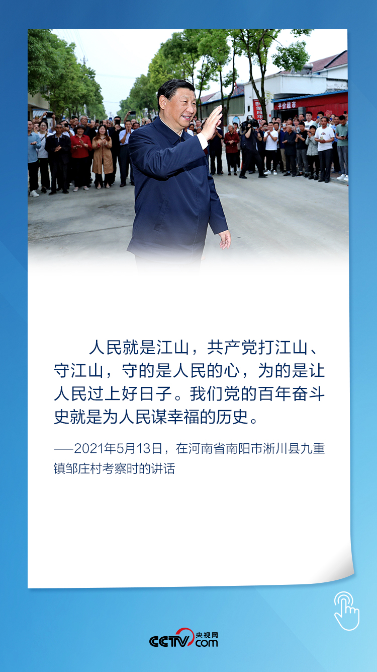 河南省南陽市、淅川縣陶岔渠首樞紐工程、九重鎮(zhèn)鄒莊村……一個個關(guān)聯(lián)地點,留下了總書記今年第六次國內(nèi)考察的足跡。看到移民村鄉(xiāng)親們的日子越過越好,總書記衷心感謝無私奉獻的移民群眾,深情地說:“人民就是江山,共產(chǎn)黨打江山、守江山,守的是人民的心,為的是讓人民過上好日子。”