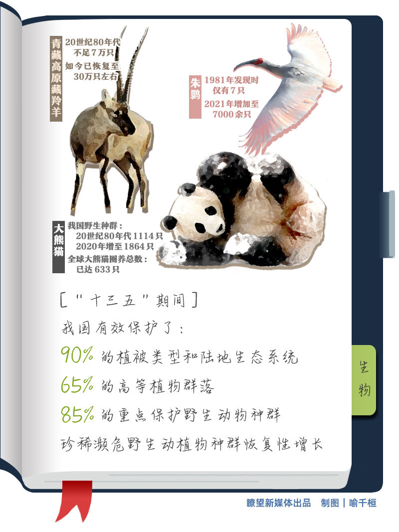 瀕危野生動植物保護不斷強化。“十三五”期間,我國有效保護了90%的植被類型和陸地生態(tài)系統(tǒng)、65%的高等植物群落,85%的重點保護野生動物種群,大熊貓、朱鹮、藏羚羊、蘇鐵等珍稀瀕危野生動植物種群實現(xiàn)恢復(fù)性增長。