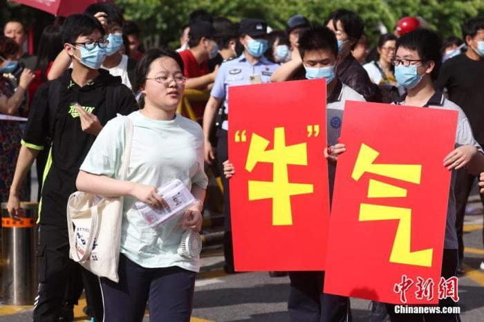 6月7日,江蘇省南京市雨花臺(tái)中學(xué)高考考點(diǎn)前,高二的學(xué)生手舉“牛氣沖天”“牛轉(zhuǎn)乾坤”字樣為考生加油鼓勁。 中新社記者 泱波 攝