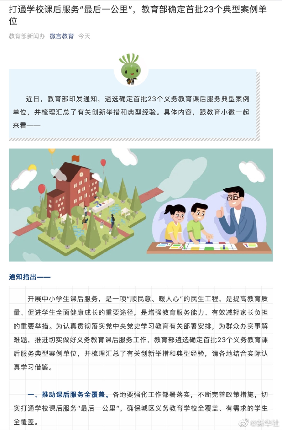 據(jù)教育部政務(wù)新媒體“微言教育”公眾號22日消息,教育部近日印發(fā)通知,為推進(jìn)做好義務(wù)教育課后服務(wù)工作,遴選確定首批23個義務(wù)教育課后服務(wù)典型案例單位,并梳理匯總了有關(guān)創(chuàng)新舉措和典型經(jīng)驗,要求各地結(jié)合實際學(xué)習(xí)借鑒。通知指出,課后服務(wù)結(jié)束時間原則上不早于當(dāng)?shù)仄毡榈恼O掳鄷r間后半小時;學(xué)校對有特殊需要的學(xué)生,可以提供延時托管服務(wù),切實解決好家長接學(xué)生困難問題。學(xué)校服務(wù)性收費和代收費具體政策由各省份制訂,嚴(yán)禁以課后服務(wù)名義亂收費。 (記者余俊杰)