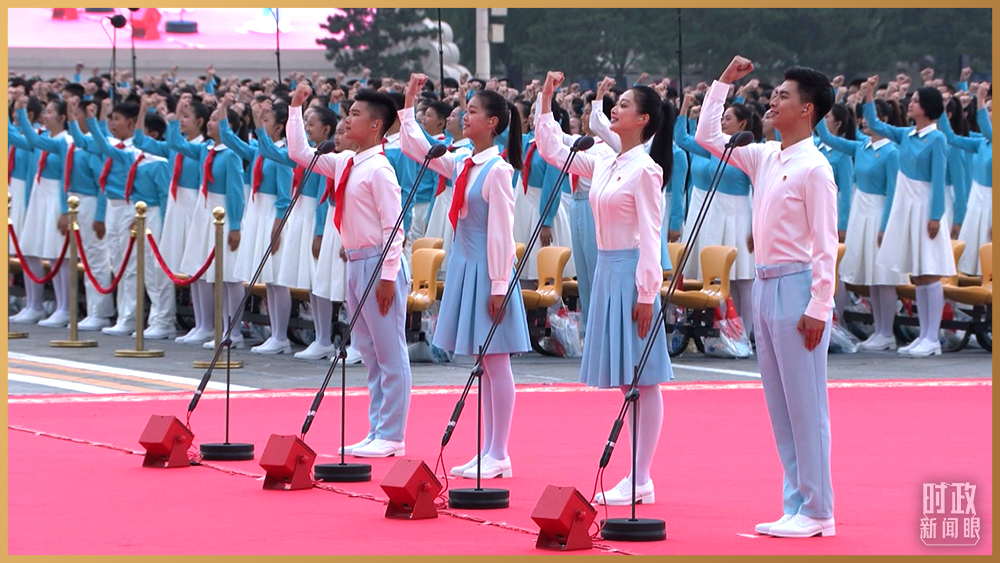 8點整,慶祝大會開始。100響禮炮響徹云霄?,F(xiàn)場升國旗、奏唱國歌。此后,各民主黨派、工商聯(lián)和無黨派人士聯(lián)合致賀詞,由共青團員和少先隊員組成的千人方陣集體致獻詞。