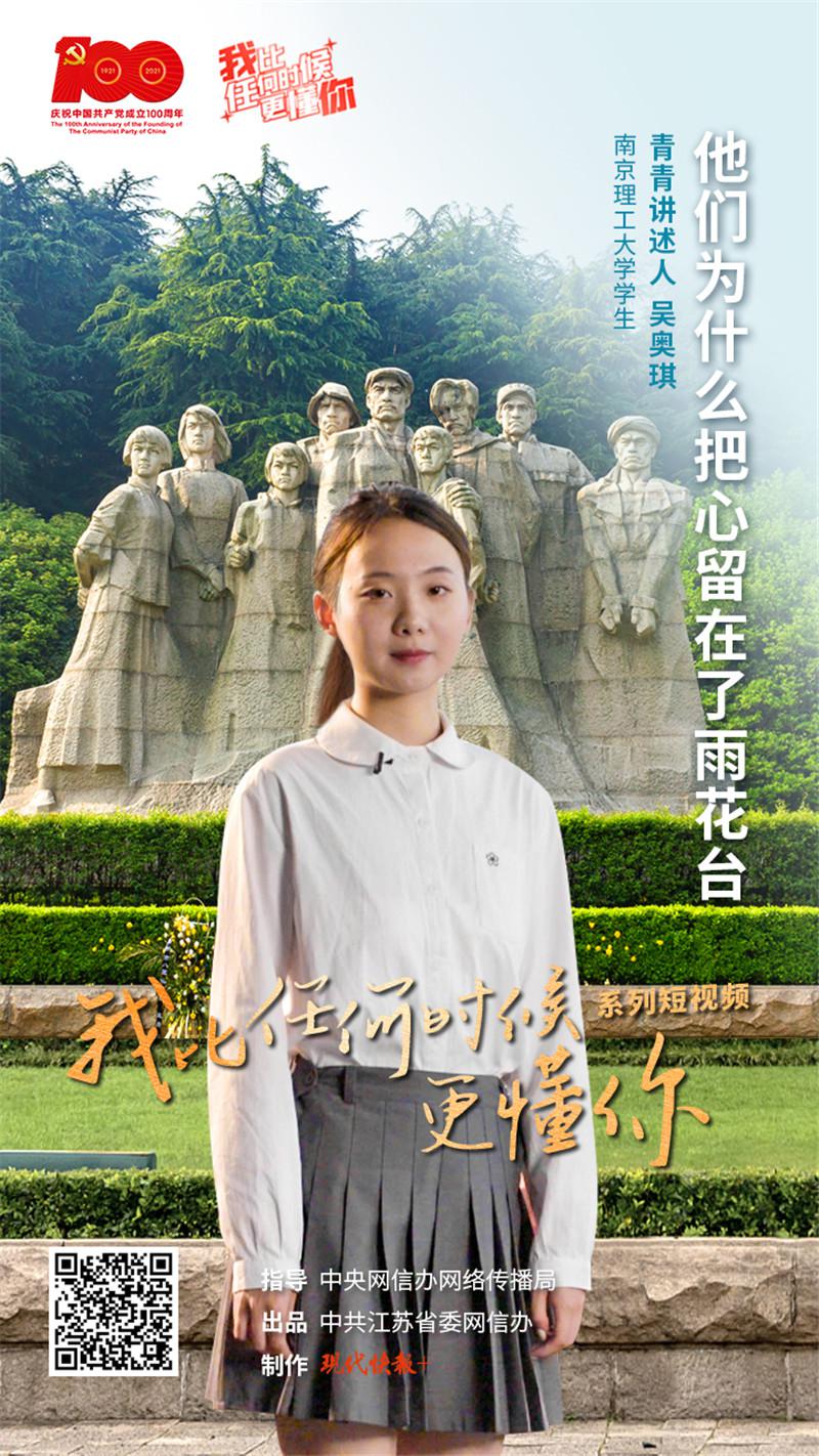 7 月 25 日," 我比任何時(shí)候更懂你 " 系列短視頻第 1 集《他們?yōu)槭裁窗研牧粼诹擞昊ㄅ_(tái)》上線。本集青青講述人是南京理工大學(xué)學(xué)生吳奧琪。" 以前了解的雨花臺(tái)大多在書本里。這一次走進(jìn)雨花臺(tái),對(duì)雨花英烈的認(rèn)識(shí)更不一樣了。"