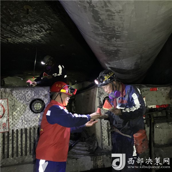 干了一上午活大家都累了吧,都來歇息一下,吃塊西瓜”在進(jìn)風(fēng)巷,掘進(jìn)三工區(qū)黨支部書記李志榮帶著可口的飯菜和一顆西瓜親臨一線慰問每個(gè)工人。
