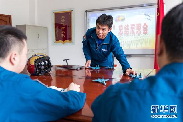 空軍航空兵某旅副參謀長姚凱(中)在大隊講評室給年輕飛行員講述對抗空戰(zhàn)比武中的經(jīng)驗教訓(2018年9月14日攝)。新華社發(fā)(張皓陽 攝)