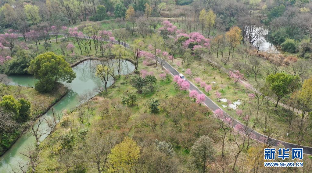 觀光車在浙江杭州西溪濕地內(nèi)行駛(2021年3月2日攝,無人機照片)。 新華社記者 翁忻旸 攝