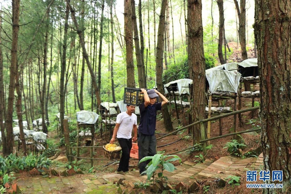 當(dāng)?shù)厝罕娫谫F州省六盤水市六枝特區(qū)月亮河鄉(xiāng)的花德河國有林場內(nèi)收獲菌類(2021年7月24日攝)。 新華社發(fā)(令狐榮駿 攝)