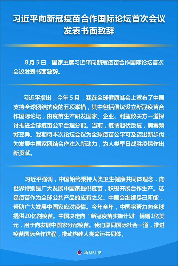 新華網(wǎng)北京8月7日電(李雪梅)8月5日,國(guó)家主席習(xí)近平向新冠疫苗合作國(guó)際論壇首次會(huì)議發(fā)表書面致辭,宣布兩項(xiàng)重要舉措:今年全年,中國(guó)將努力向全球提供20億劑疫苗;中國(guó)決定向“新冠疫苗實(shí)施計(jì)劃”捐贈(zèng)1億美元,用于向發(fā)展中國(guó)家分配疫苗。